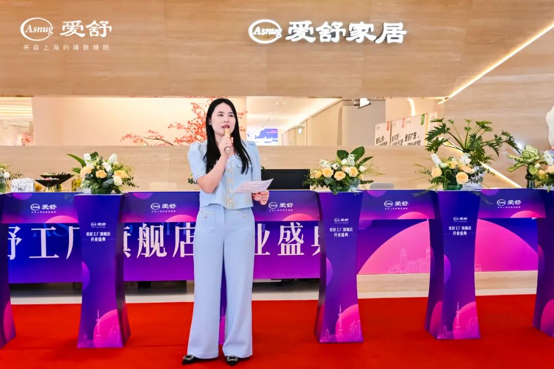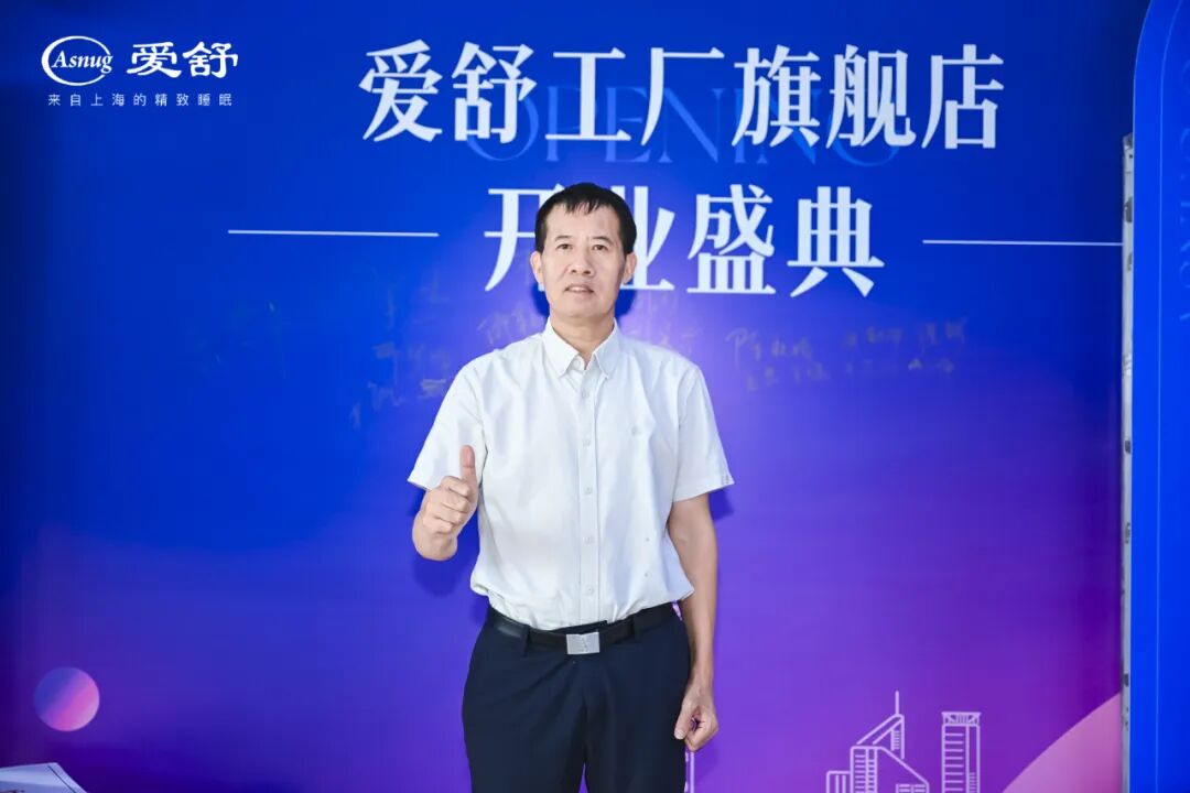 “感恩时代机遇,政府各级领导的支持,感恩每一位合作伙伴与全体员工的并肩,是大家的携手努力,创造出爱舒美好的今天!这座工厂旗舰店的落成,是我们爱舒品牌战略升级的重要一步,希望这里能成为我们共同事业的新起点和新加油站。预祝本次开业典礼圆满成功,祝愿各位朋友生活事业蒸蒸日上,身体健康,谢谢大家!”